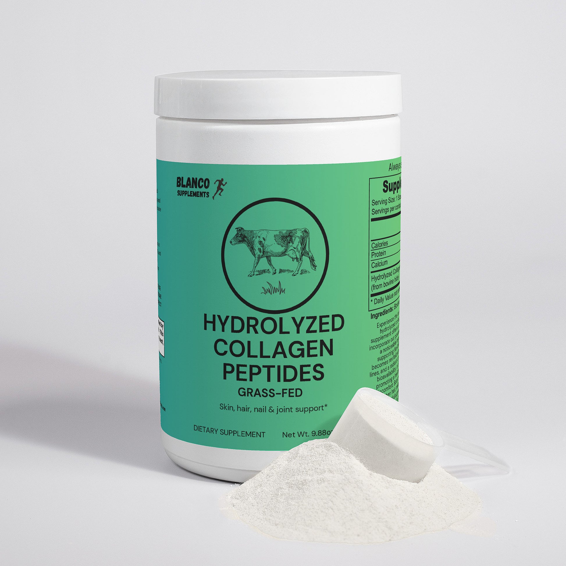 Description on bottle: Experience the transformative power of our grass-fed hydrolyzed collagen peptides powder. This crafted supplement offers a multitude of incredible benefits. As you incorporate our powder into your daily routine, you'll discover a noticeable improvement in joint and bone health, supporting flexibility and mobility. Watch as your skin becomes revitalized, with enhanced elasticity, reduced fine lines, and a radiant complexion. With its rapid absorption and bioavailability, our hydrolyzed collagen peptides aid in promoting a healthy gut, providing relief from digestive discomfort. Boost your natural collagen production and strengthen hair, nails, and connective tissues, resulting in a radiant, youthful appearance. Discover the incredible benefits of our grass-fed hydrolyzed collagen peptides and unlock your true potential today.